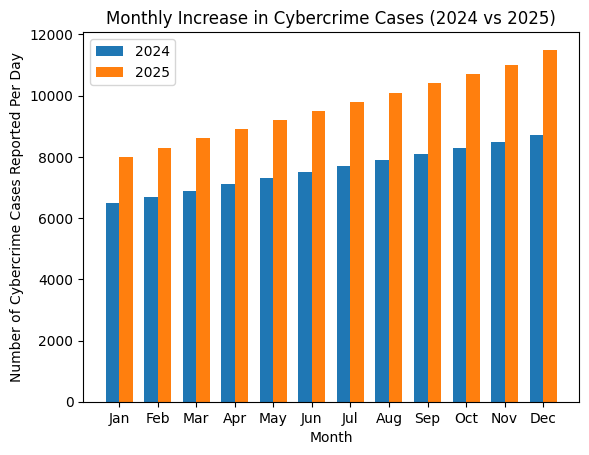 The bar graph shows a monthly comparison of cybercrime cases reported per day in 2024 and 2025. It clearly illustrates a steady increase throughout both years. In 2024, the number of cases starts at around 6,500 in January and gradually rises to about 8,700 by December. However, in 2025, the cases began at a much higher number (around 8,000) and increased sharply to approximately 11,500 by December.