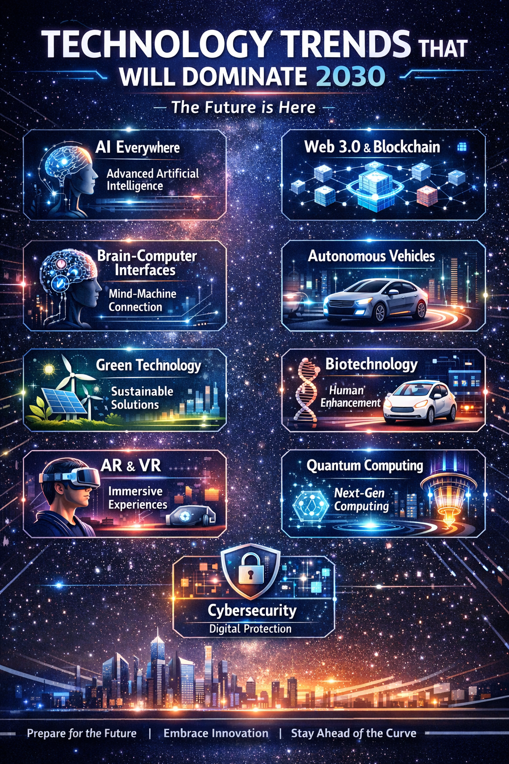 By 2030, technology will be the foundation of success. Take charge: start learning, embrace change, and build your expertise now. Seize these trends to lead tomorrow’s world—position yourself at the center of the future today. Your journey to thrive in this new era begins now: take action, connect with innovators, and make technology your greatest ally.