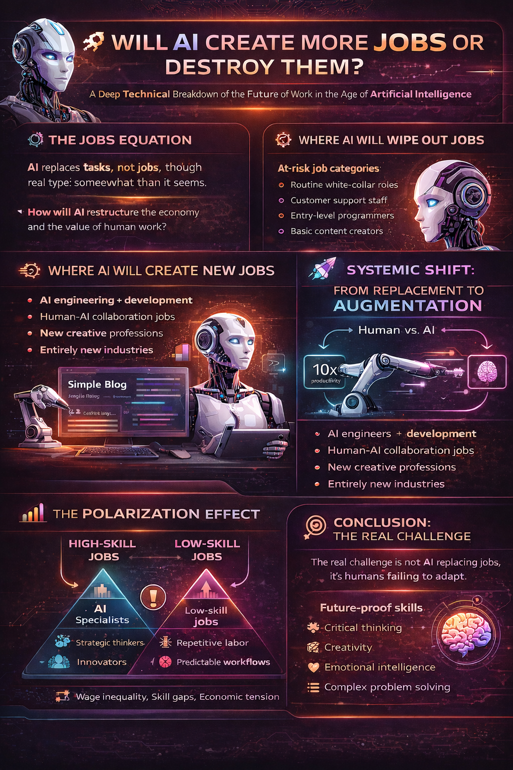 🚀 Will AI Create More Jobs or Destroy Them? A Deep, Technical, and Structural Analysis of the Future of Work in the Age of Artificial Intelligence ec2e223b-7ce4-41ff-80cd-f008fafc3600.png 🧠 Introduction: Beyond the Simplistic Debate The question “Will AI create more jobs or destroy them?” is often framed too simply. It assumes: * Jobs are static * Technology replaces entire roles. * The labor market reacts instantly. None of this is true. What we are actually witnessing is a structural transformation of labor, driven by advances in artificial intelligence from organizations like OpenAI, Google, and Microsoft. The real question is: How does AI reorganize the economic value of human work? ⚙️ The First Principle: AI Replaces Tasks, Not Jobs To understand impact, we need to model jobs as bundles of tasks. 🧩 Job Decomposition Model A job = * Routine Cognitive Tasks * Routine Physical Tasks * Non-Routine Cognitive Tasks * Non-Routine Social Tasks AI systems excel in: * Pattern recognition (vision, NLP) * Statistical prediction * Optimization problems This means AI targets: * High-frequency, low-variance tasks 🔍 Technical Insight Modern AI (especially transformer-based systems) operates on: 9b08ccff-1b4e-4df5-935c-334210e9c476.png This probabilistic modeling allows systems like ChatGPT to: * Generate language * Automate reasoning patterns * Simulate structured thinking 👉 But it does not imply true general intelligence or full job replacement. --- 📉 Where AI Actually Destroys Jobs (Deep Analysis) Job destruction is real but uneven. 1. Routine Cognitive Automation Roles based on: * Deterministic rules * Structured data * Repetitive workflows Examples: * Data entry clerks * Basic accountants * Tier-1 support agents These tasks are: * Easily encoded * Highly predictable * Scalable via AI --- 2. Software Development Disruption (Entry-Level) AI tools like GitHub Copilot are transforming the economics of programming. Before AI: * Junior developers handled boilerplate. * Seniors handled architecture After AI: * AI handles boilerplate * Juniors lose the entry pathway. 📌 Key Structural Shift: The “learning ladder” in tech is becoming increasingly compressed. --- 3. Content Commoditization Generative AI has reduced the marginal cost of content to near zero. Impacted: * SEO writers * Copywriters (low complexity) * Basic designers ⚠️ Important Distinction AI doesn’t eliminate content creation—it commoditizes average-quality output. --- 📈 Where AI Creates Jobs (Deep Structural View) AI is not just automation—it’s a general-purpose technology (GPT), similar to electricity or the internet. 1. New Technical Layers AI introduces entirely new layers in the tech stack: * Model Training Infrastructure * Data Engineering Pipelines * AI Deployment Systems * Monitoring & Alignment This creates roles like: * ML Engineers * AI Ops (MLOps) Specialists * Alignment Researchers --- 2. Human-AI Interface Economy A new class of work emerges at the boundary between humans and machines. Examples: * Prompt Engineering * AI Workflow Design * Human-in-the-loop systems These roles exist because: AI is powerful—but not autonomous. --- 3. Complementary Job Expansion AI increases productivity, which leads to: * Lower costs * Higher demand * Market expansion This is known as the productivity paradox loop: 1. AI reduces cost 2. Prices drop 3. Demand increases 4. More jobs created --- 🔄 The Economic Engine: Creative Destruction This phenomenon is best explained by: Creative Destruction A concept from Joseph Schumpeter Mechanism: * Old industries collapse * New industries emerge * Net effect: economic evolution AI is accelerating this cycle. --- ⚖️ The Polarization Effect AI doesn’t impact all jobs equally—it creates labor market polarization. 🔺 High-Skill Jobs (Expansion) * AI architects * Researchers * Strategic decision-makers 🔻 Low-Skill Jobs (Decline) * Repetitive labor * Predictable services ⚠️ Middle-Skill Jobs (Most Disrupted) * Analysts * Technicians * Administrative roles 📌 This leads to: * Wage inequality * Skill gaps * Economic tension --- 🧠 Augmentation vs Automation: The Real Paradigm The dominant model is not replacement—it’s augmentation. 🧩 Human + AI System Instead of: * AI replacing doctors We get: * AI assisting diagnosis * Humans are making final decisions. 🔍 Technical Framing AI acts as: * A probabilistic reasoning engine * A pattern recognition layer * A decision-support system Humans provide: * Context * Ethics * Judgment --- ⏳ Time Dynamics: Why Job Loss Feels Faster Than Job Creation A critical asymmetry exists: Job Destruction: * Immediate * Visible * Concentrated Job Creation: * Gradual * Distributed * Requires reskilling This creates the illusion: “AI is only destroying jobs.” --- 🌍 Macroeconomic Implications Countries that invest in AI: * Gain productivity advantages * Attract talent * Lead innovation Countries that lag: * Face automation without creation * Experience unemployment spikes --- 🎯 The Skill Shift: What Actually Matters Now The future is not about job titles It’s about capabilities 🔥 AI-Resistant Skills 1. Complex Problem Solving 2. Systems Thinking 3. Creativity & Originality 4. Emotional Intelligence 5. Interdisciplinary Knowledge 💡 Meta-Skill Learning how to learn faster than technology evolves --- ⚠️ The Biggest Misunderstanding AI is often seen as: * A replacement force But in reality, it is: * A force multiplier The real displacement happens when: Humans compete against AI instead of with it. --- 🔮 Future Scenarios (2030–2040) Scenario 1: Optimistic (Augmentation Economy) * Humans + AI collaboration * Massive productivity growth * New job categories dominate Scenario 2: Pessimistic (Automation Shock) * Rapid job displacement * Slow reskilling * Economic inequality rises Scenario 3: Realistic (Hybrid Transition) * Mixed outcomes * Gradual adaptation * Continuous disruption --- 